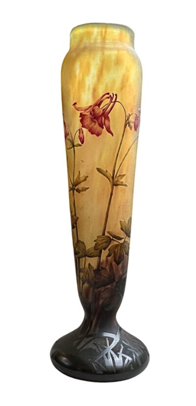 • Large, Signed Daum Nancy – French Cameo Glass vase with Enamelled ‘Columbine’ Decoration. circa 1900