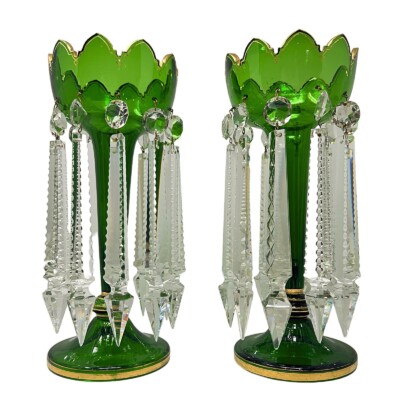 Pair of Bohemian Emerald Green Glass Mantle Lustres each with Hanging Crystal Prisms, Late 19th Century