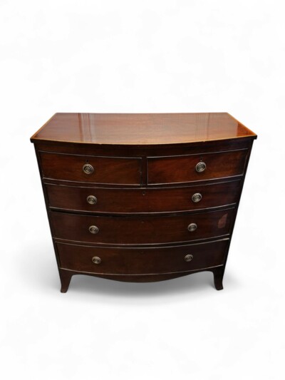 • Timeless English Georgian Period Bow Front Chest of Drawers with Satinwood Inlay Trim, Early 19th Century