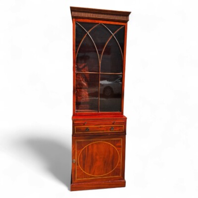 • English Tall & Narrow Mahogany Cabinet with Satinwood Inlay, Single Glazed Door, Circa 1890s