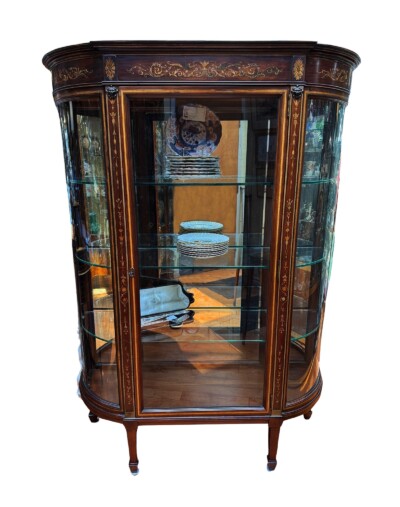 • Fine Quality Edwardian Mahogany Display Cabinet with Satinwood Inlay & Curved Glass, Circa 1900