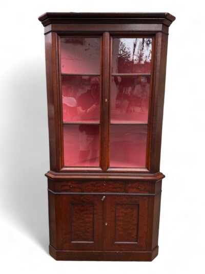 Victorian Corner Cabinet with Burled Wood Panels and Original Glass