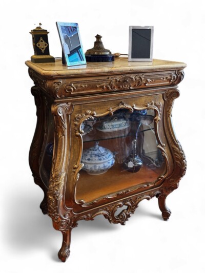 • French Louis XV Style Gilt Wood Curio Cabinet with Curved Glass and Marble Top – circa 1900