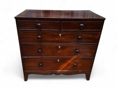 • Georgian Era, Early 19th Century, Petit Mahogany Bachelor Chest of Drawers with Ivory Escutcheons