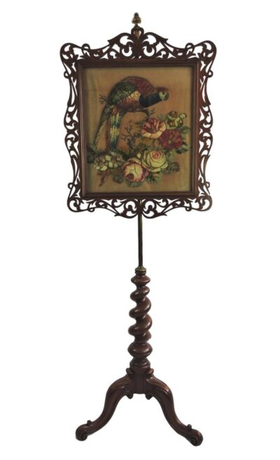 • Victorian Mahogany & Brass Telescopic Fire Screen with Needlepoint and “Berlin Wool” Embroidery – Parrot & Roses Design – circa 1860