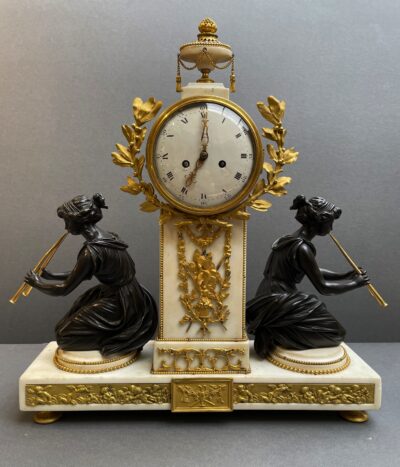 • 18th Century Louis XVI Period Marble, Bronze Figures & Gilt Bronze Silk Suspension Mantel Clock