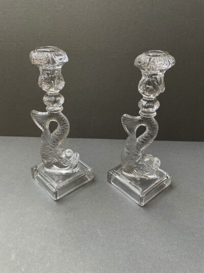 • Pair of Glass Candle Holders with Dolphin Decorations, Imperial Glass Co. signed MMA