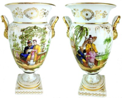 • Pair Old Paris Porcelain, French Vases with Chinese Figural Paintings, c. 1860