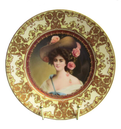 • Royal Vienna Portrait Plate – “Rose de Mai”, Border Embossed with Gold Decoration of Grapes & Leaves