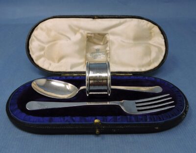 • English Hallmarked Sterling Silver Child’s Set – Monogrammed Fork, Spoon and Banded Napkin Ring, Original Leather Box