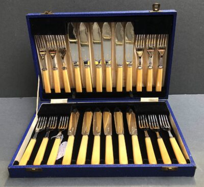 English Mother of Pearl & Sterling (Blades & Tines) – Fruit set for 12 (24 pieces) – dated 1905