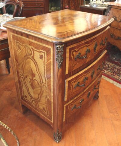 French Marquetry Small 3 Drawer Chest with Bronze Mounts and Handles.