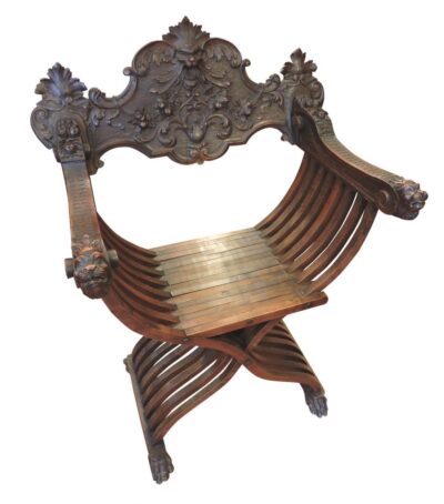 Italian – Savonarola Renaissance Carved Walnut Slats Foldable Chair