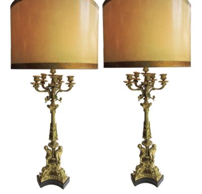 Pair of French Gilt Bronze 6-Branch Louis Philippe Candelabra Putti Table Lamps, c. 1860
