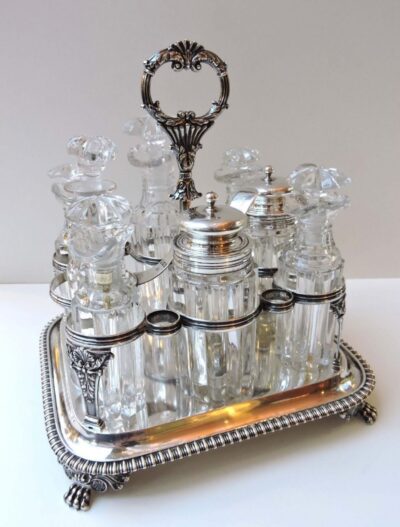 LARGE GEORGIAN Sterling & Crystal 8 bottle CRUET SET in Sterling Holder – London 1828 – William Easterbrook