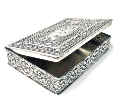 Embossed German Silver Rectangular Small Box with Courtier Scene – Gold Wash Interior. Maker: Johann S. Kurz