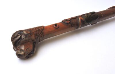 19th Century Folk Art Walking Stick/Cane With Hand-Carved Dog Head, Parrot and Snake