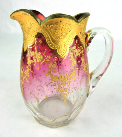 19th C. Signed Moser Glass Small Cranberry Pitcher with Heavy Gold & Leaves Decoration.