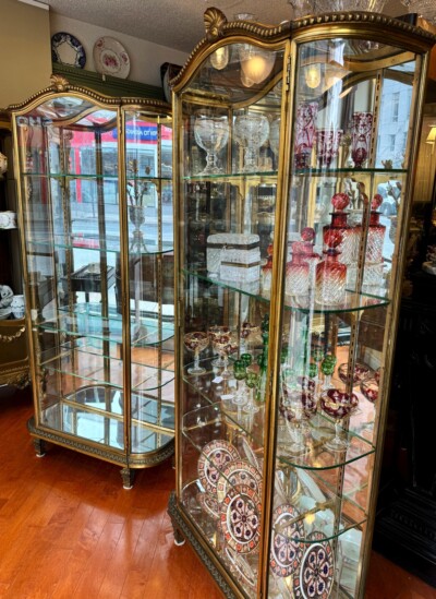 Pair of Spectacular Gilt Bronze Display Cabinets with Curved Glass Sides and Glass Shelves. French, mid 20th century.