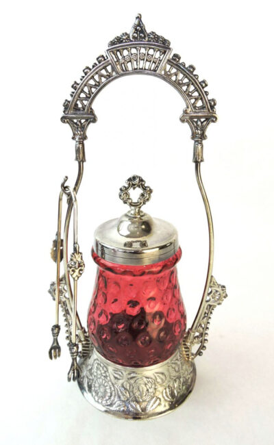 Coin-Spot Pattern Cranberry Glass Pickle Cruet in Elaborate Silver-Plated Stand with Tongs, c. 1880