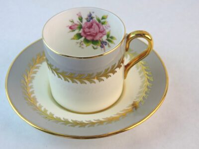 Aynsley Bone China Demitasse Cups and Saucers – Floral with Grey & Gold Decor.
