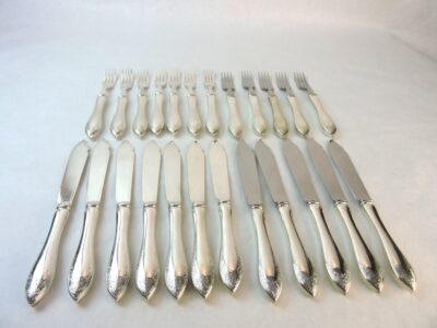 24 Birks Sterling Silver Fish Knives and Forks, Tudor Scroll Pattern
