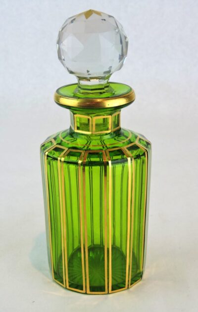 Baccarat France Cut Crystal Perfume Bottle in Green and Gold with Clear and Gold Stopper