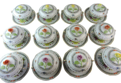 Set of 12 Herend Hungary Hand Painted Porcelain Covered Cream Soups with Under-plates. Indian Basket Pattern.