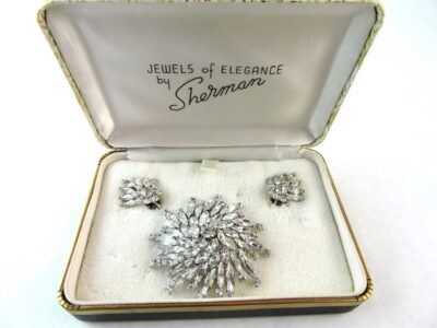 Signed Clear Sherman Brooch / Pendant and Matching Earrings Set in Original Box.