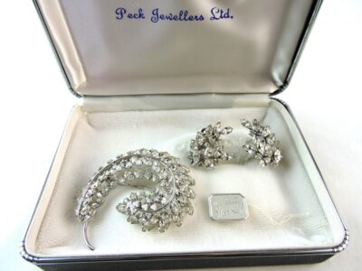 Signed Two-Level Clear Sherman Swirl Leaf Brooch and Earrings in Jeweller’s Box
