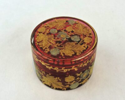 Small Moser Cranberry Glass Covered Box with Elaborate Gilt and Silver Enamel Decoration, c. 1890