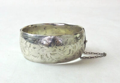 Sterling Silver Engraved & Hinged, Wide Cuff Bracelet with Safety Chain