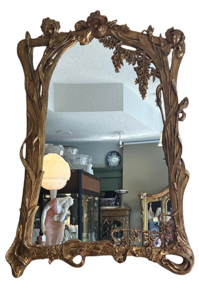 Large Art Nouveau Style Gilt Mirror with Iris Flower Detail, Circa Mid 20th Century