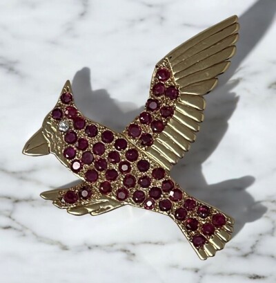 Canadian Cardinal Brooch/Pendant in 14K Yellow Gold, with 1 Diamond & 49 Rubies