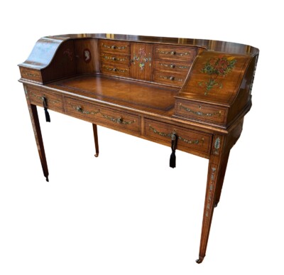 Edwardian Period Satinwood Large Carlton House Desk With Hand Painted Florals and Swags.