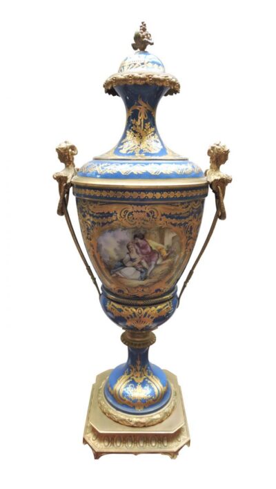 19th Century French Powder Blue Porcelain, Gilt Bronze, Gold and Hand Painted Covered Vase.