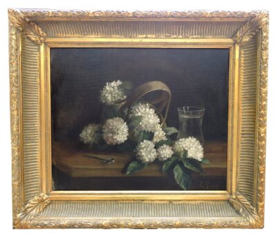 19th Century British Oil Painting on Canvas – Still Life Hydrangias – E. Gibson