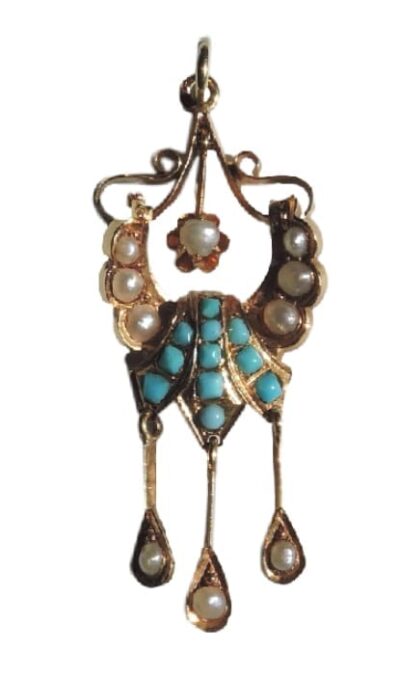 Victorian Belle Epoque – French 18 Karat Gold Pendant With Carre Cut Cabouchon Turquoiqes & Seed Pearls