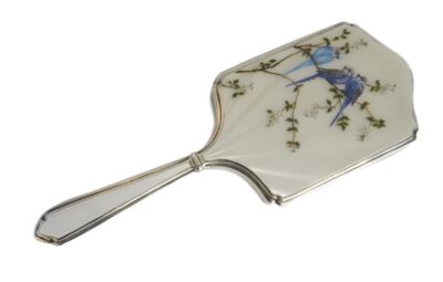 English Sterling & Enamel Decorated with Birds – Dressing Table Hand Mirror – London. Dated 1947.