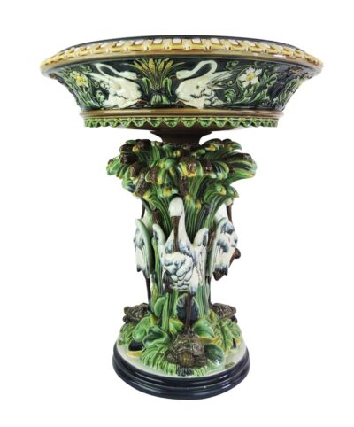 Austrian Majolicia Centerpiece Pedestal Bowl with Cranes on Turtle backs.