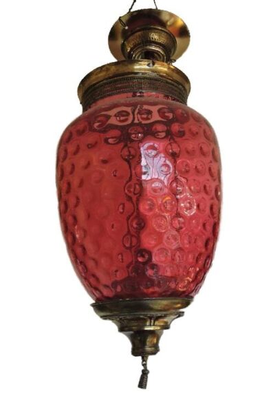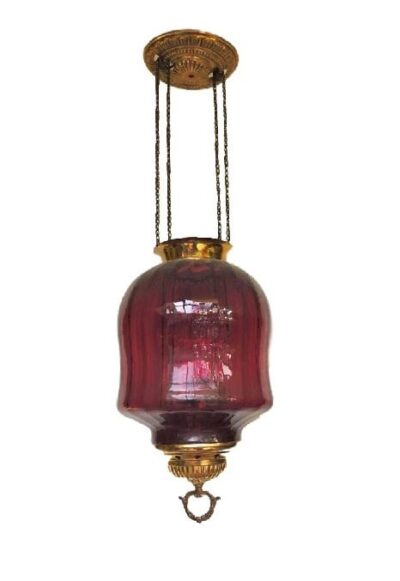 Victorian Gilt Brass & Cranberry Glass Hanging Parlor Lamp. c.1870