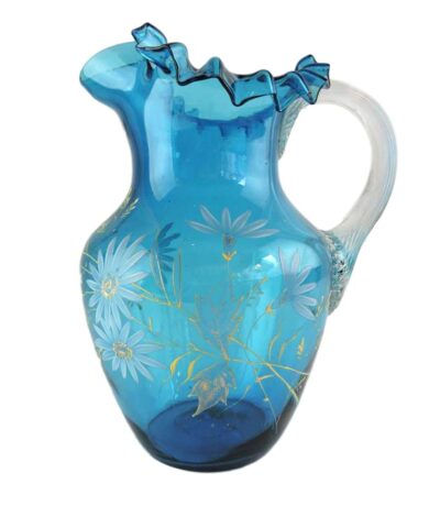 Victorian Blue Ruffled Hand-Painted Glass Jug. c.1870