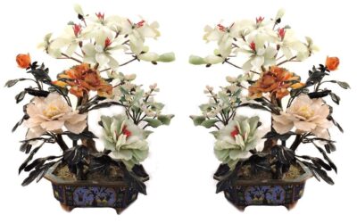 Pair of Large Chinese Hardstone Floral Bouquets with Cloissonne Pots