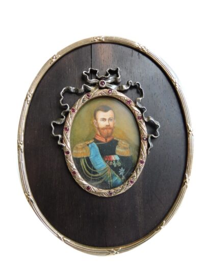 Russian Gold & Rubies , Wood Back Frame – Pre-Revolution, Painted Miniature of “Tsar Nicholas II ” – Bearing Faberge Marks – 14kt & 9kt Gold & Rubies front with .88 Silver back easel Support.