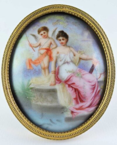 Miniature Painting of Lady and Cherub on Porcelain. Circa, 1900.