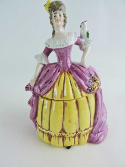 German Sitzendorf Figural Porcelain Powder Box – Madame in Violet and Yellow With Bird