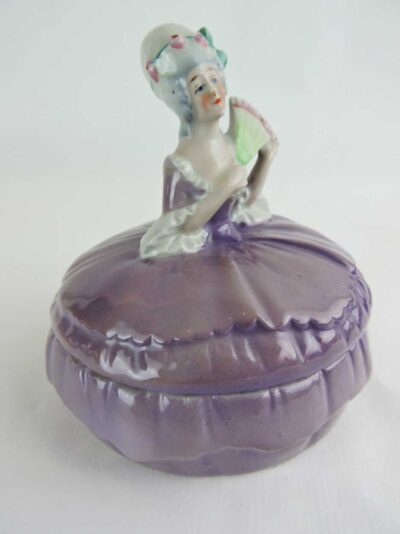 German Figural Porcelain Powder Box – Lady in Violet With Fan and Flowers