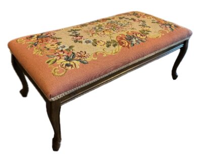 Queen Anne Style Walnut Pink Needlepoint Covered Fireside Bench – c. 1910
