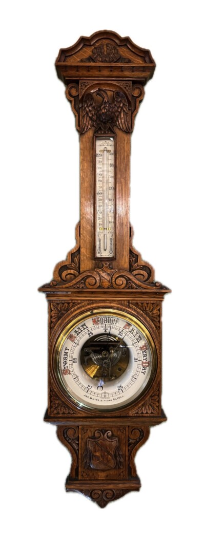 Scottish Carved Oak Skeletal Aneroid Barometer with Eagle & Shields Decoration – Jas. White, Glasgow.