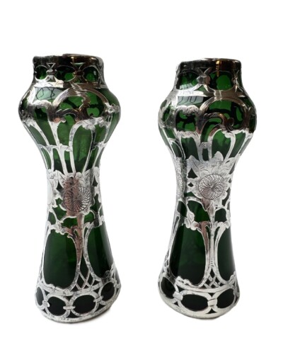 Pair of Art Nouveau American Silver Overlay over Green Glass Vases – Alvin 999/1000 circa 1900